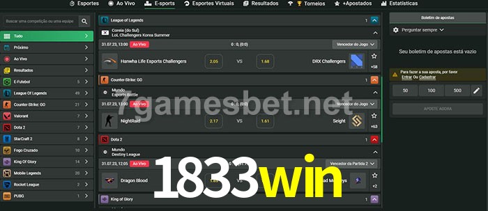 O 1833win oferece uma grande seleção de opções de apostas em e-sports com probabilidades competitivas